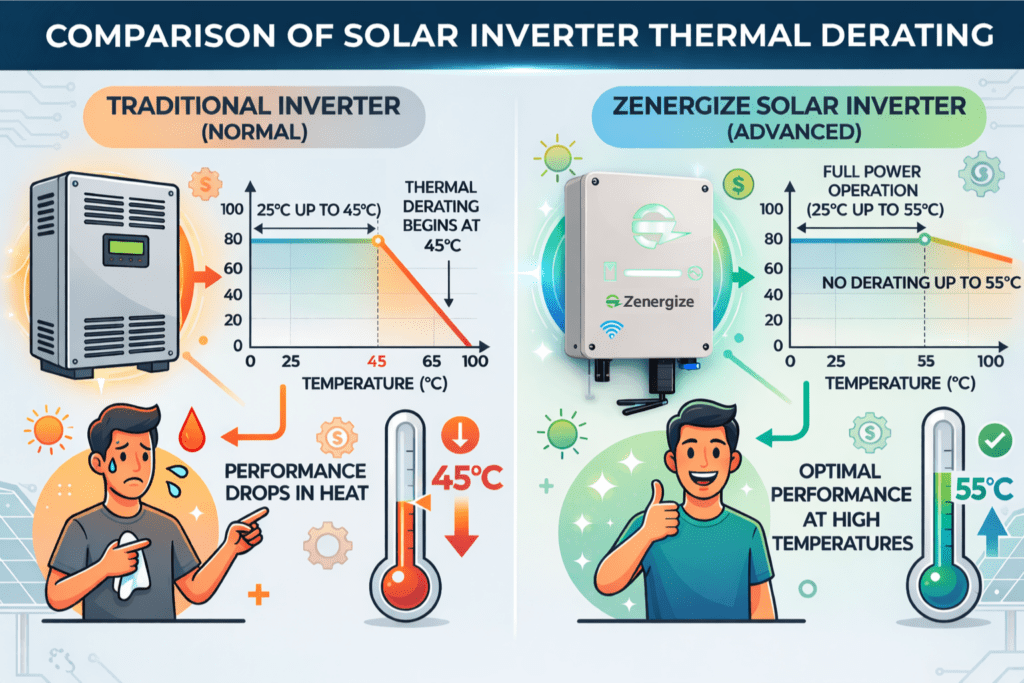 This is called temperature derating, and it is one of the most under-discussed performance problems in the Indian solar and power electronics market.